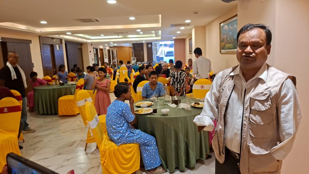 शुभारम्भको सन्देशः ड्रिम इन्टरनेशनल होटलको शुभारम्भमा आफूले आश्रममा राखेका विभिन्न जिल्लाका ४५ जनालाई लिएर आएका अध्यक्ष डोलबहादुर रामदाम (विश्वकर्मा) । तनहुँबाट २०६६ सालमा रुपन्देहीमा आएर आश्रम खोलेका रामदामको समेत दुर्घटनामा परेर दुवै हात गुमाएका छन् । हात नभएपनि काम गर्न सकिन्छ भन्ने बलियो उदाहरण उनले दिएका छन् । सो आश्रममा रहेका व्यक्तिहरुलाई काम सिकाएर आत्मनिर्भर बनाउने उनको योजनामा पर्यटन व्यवसायी तथा उद्यमी रानाजस्ता समाजसेवीको योगदान छ । तस्बिरः अमृत गिरी/मेचीकाली