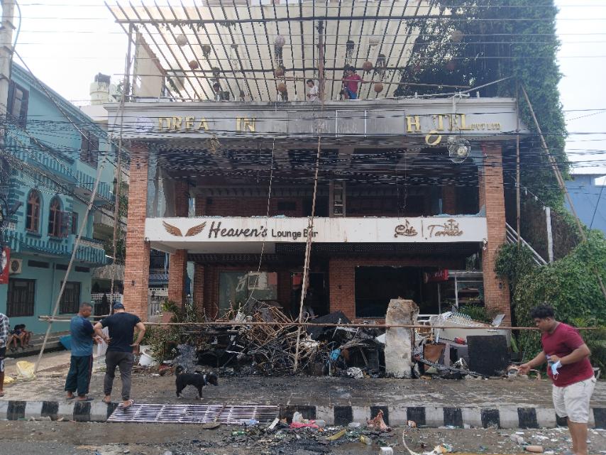 यो होटलमा कुनै दलका नेताको लगानी छ भनेर विध्वंशकारीले आक्रमण गरे । तोडफोड गरे, लुटपाट र आगजनी गरे । केही दिनपछि नै उनले यहाँको खरानीबाट माथि उठ्दै आज पुनः सञ्चालनको तहमा ल्याइपु¥याएका छन् ।
