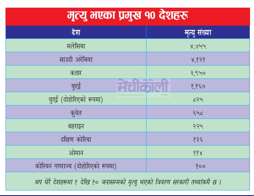 देश अनुसार नेपाली मृत्यु हुने संख्या
