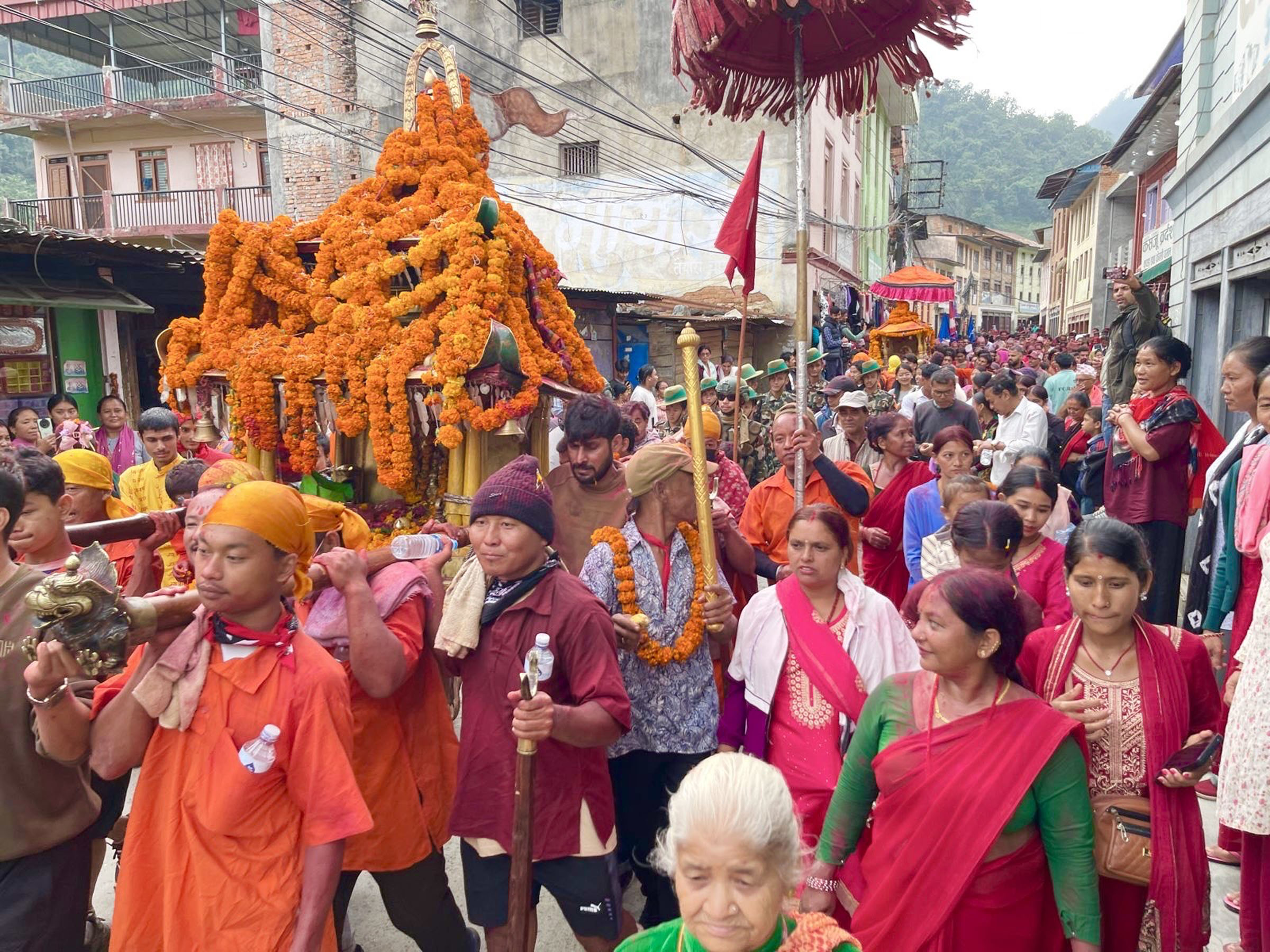 गुल्मीको पवित्र तिर्थस्थल रूरू क्षेत्रको रिडीमा आइतबार पञ्चे बाजा र भजनकिर्तन सहित भगवान ऋषिकेश र लक्ष्मीनारायणको रथ यात्रामा सहभागी भक्तजनहरु। तस्बिरः जनार्दन घिमिरे/रासस