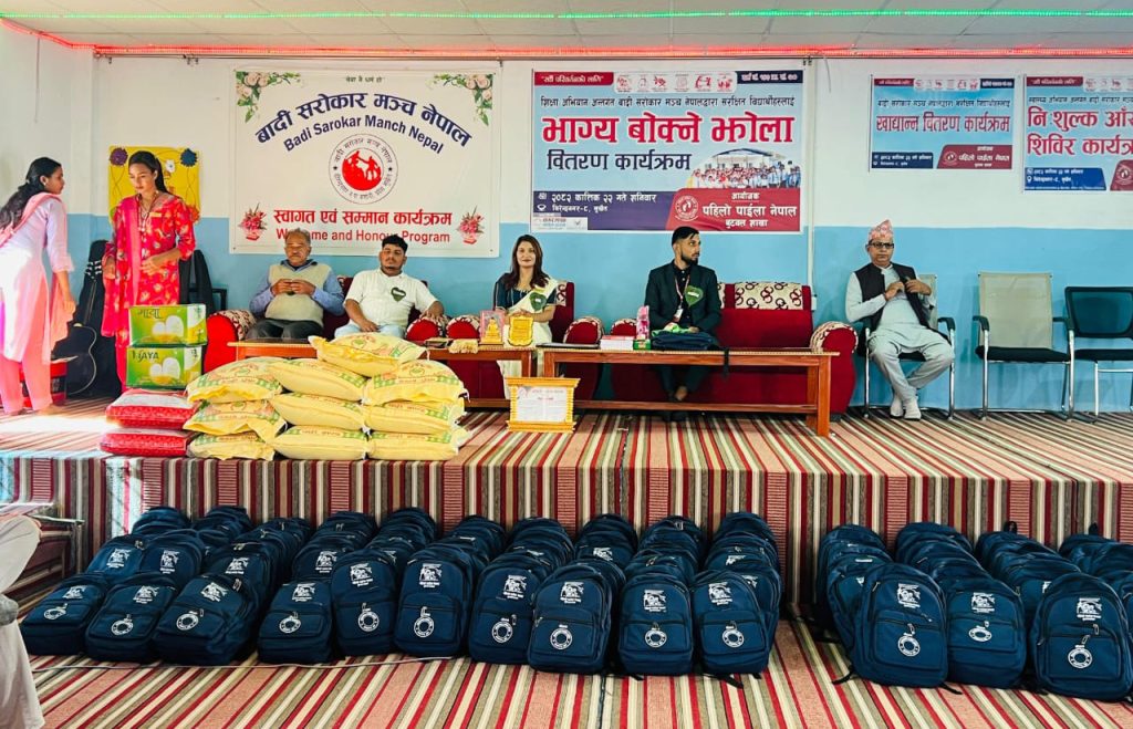 ‘शिक्षा नै भविष्यको ढोका हो’ भन्ने सन्देशसहित संस्थाले ११० जना बादी बालबालिकालाई शैक्षिक सामग्री सहितको ‘भाग्य बोक्ने झोला’ वितरण गरेको हो । झोलामा कपी, कलम, पेन्सिल, इरेजर, कटर, कलर, ज्यामिती बक्स, पानीको बोतल, टिफिन बक्स र रुमाल समावेश गरिएको भाग्य बोक्ने झोला कार्यक्रमका संयोजक संस्थाका द्वितीय उपाध्यक्ष मनिस खनालले जानकारी दिए । यो कार्यक्रमका लागि मनिष संयोजक र सदस्यमा सोमनाथ खनाललाई तोकिएको थियो ।