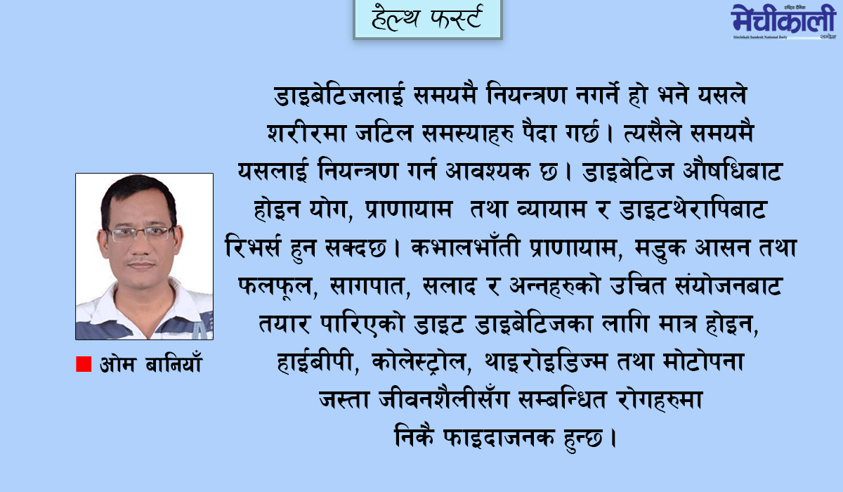 डाइबेटिजलाई समयमै नियन्त्रण नगर्ने हो भने यसले शरीरमा जटिल समस्याहरु पैदा गर्छ । त्यसैले समयमै यसलाई नियन्त्रण गर्न आवश्यक छ । डाइबेटिज औषधीबाट होइन, योग, प्राणायाम तथा व्यायाम र डाइटथेरापिबाट रिभर्स हुन सक्दछ । कभालभाँती प्राणायाम, मडुक आसन तथा फलपूmल, सागपात, सलाद र अन्नहरुको उचित संयोजनबाट तयार पारिएको डाइट डाइबेटिजका लागि मात्र होइन, हाइबिपी, कोलेस्ट्रोल, थाइरोइडिज्म तथा मोटोपना जस्ता जीवनशैलीसँग सम्बन्धित रोगहरुमा निकै फाइदाजनक हुन्छ ।