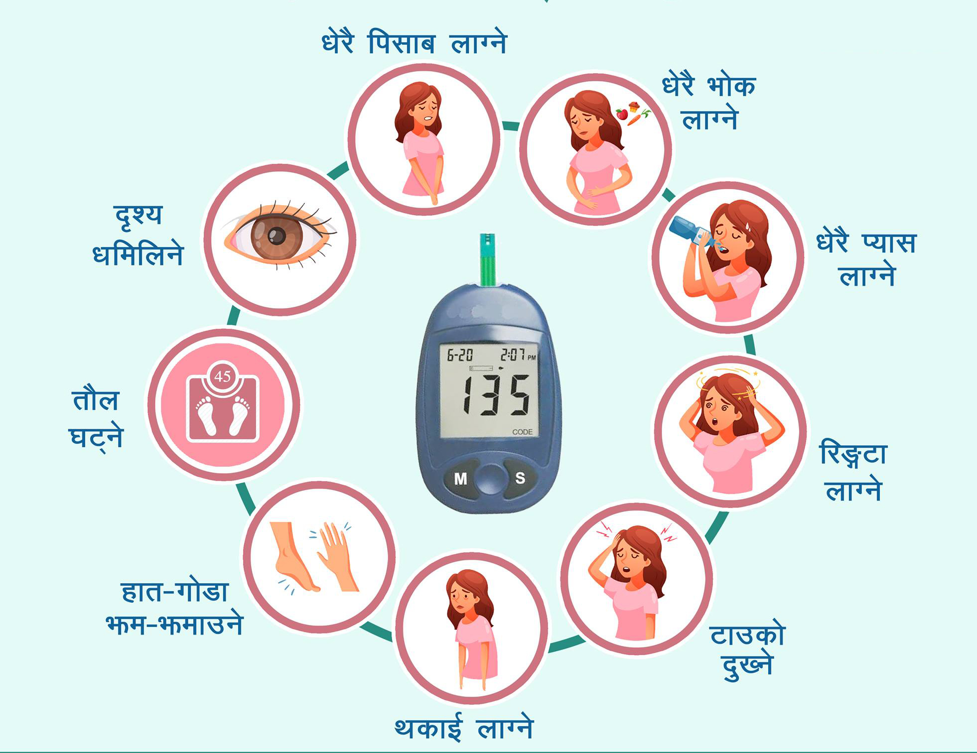 मधुमेह नेपालमा नसर्ने रोगहरुमेध्येको प्रमुख रोगको एक महत्वपूर्ण समस्या बनेको छ । उदाहरणका लागि, नेपालमा नसर्ने रोगका कारण मृत्यु तथा संक्रमण निकै बढेको छ । मधुमेहलाई समयमै पत्ता लगाउन नसकिँदा इन्सुलिन वा औषधी उपलब्धताको अभावमा समस्या अरु धेरै बढ्ने गरेको पाइएको छ । मिर्गौला समस्या, मुटु समस्या, आँखाको समस्या बढिरहेको छ । यसले स्वास्थ्य प्रणालीमा अतिरिक्त भार पु¥याएको छ ।