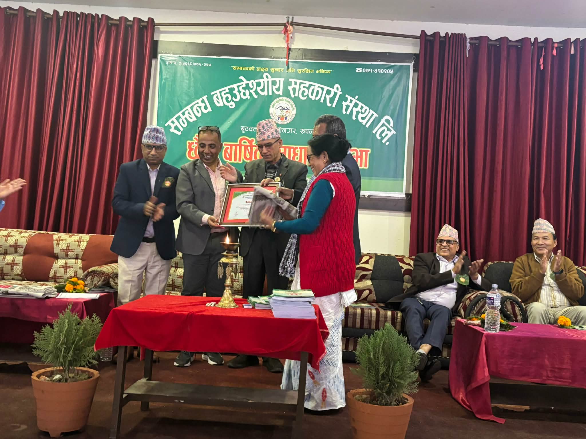 बुटवल, मंसिर २० । बुटवल–११ देवीनगरस्थित सम्बन्ध बहुउद्देश्यीय सहकारी संस्था लिमिटेडको ६ औं वार्षिक साधारण सभा शनिबार सम्पन्न भएको छ । सहकारीका अध्यक्ष लोकराज शर्माको अध्यक्षता तथा बुटवल उपमहानगरपालिका वडा नम्बर ११ का वडाअध्यक्ष रामचन्द्र खनालको प्रमुख आतिथ्यतामा कार्यक्रम भएको हो । सो अवसरमा बोल्दै अध्यक्ष खनालले सहकारीलाई बलियो बनाउदै उत्पादन केन्द्रित बन्न आग्रह गरे ।