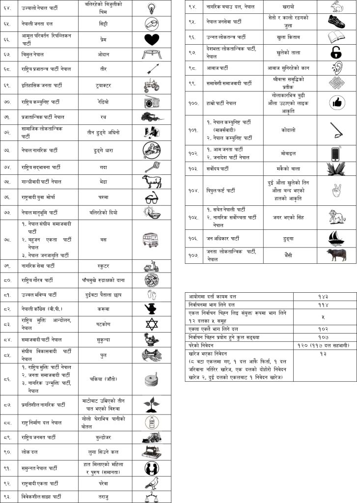 आयोगमा दर्ता भएका १४३ दलमध्ये निर्वाचनमा भाग लिन ११४ दलले निवेदन दिएका थिए। तीमध्ये १०७ वटा निर्वाचन चिह्न प्रयोग हुने भएका छन्।