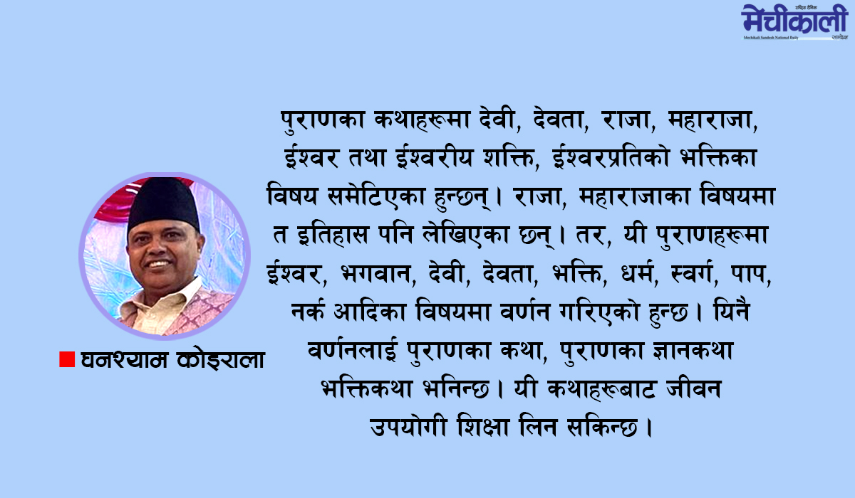 यी पुराणहरूमा धेरै कथाहरू हुन्छन् । यी कथाहरूमा देवी, देवता, राजा, महाराजा, ईश्वर तथा ईश्वरीय शक्ति, ईश्वरप्रतिको भक्तिका विषय समेटिएका हुन्छन् । राजा, महाराजाका विषयमा त इतिहास पनि लेखिएका छन् । तर, यी पुराणहरूमा ईश्वर, भगवान, देवी, देवता, भक्ति, धर्म, स्वर्ग, पाप, नर्क आदिका विषयमा वर्णन गरिएको हुन्छ । यिनै वर्णनलाई पुराणका कथा, पुराणका ज्ञानकथा, भक्तिकथा भनिन्छ । पुराणहरूमा धेरै कथा हुन्छन् । यी कथाहरूबाट जीवनोपयोगी शिक्षा लिन सकिन्छ ।