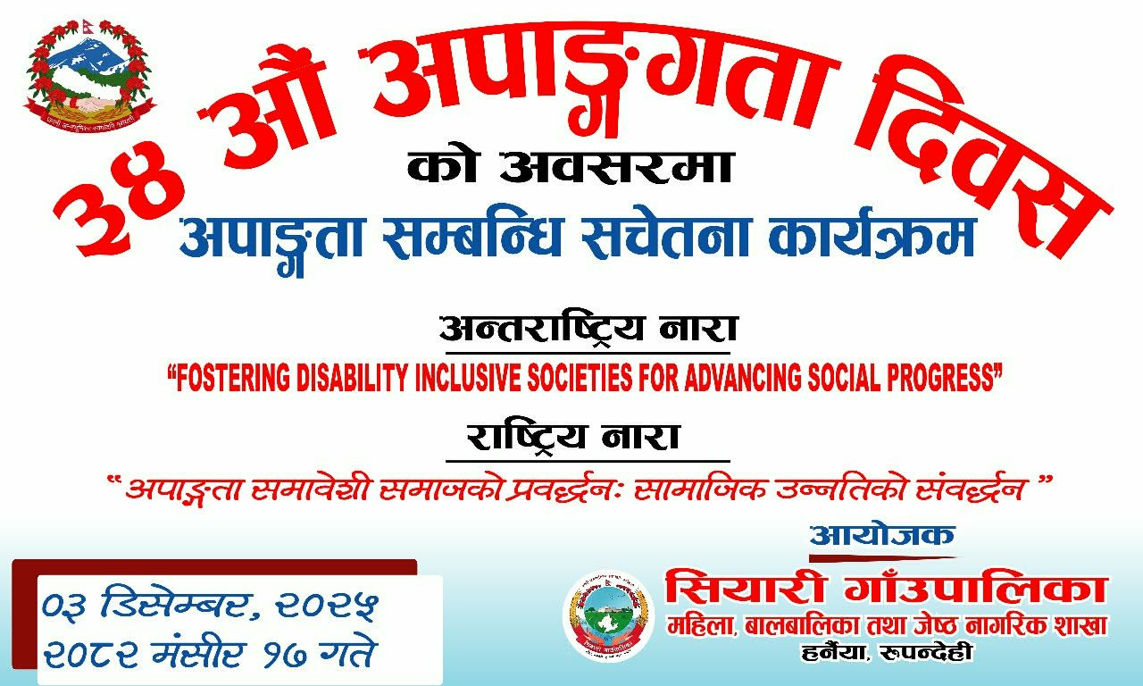 रुपन्देहीको सियारी गाउँपालिका महिला बालबालिका तथा जेष्ठ नागरिक शाखाको आयोजनामा अपाङ्गगता सम्बन्धि कार्यक्रम हालै सम्पन्न भएको थियोे ।
