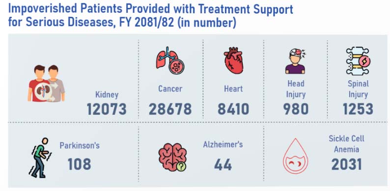 संघीय स्वास्थ्य तथा जनसंख्या मन्त्रालयको तथ्यांकअनुसार आर्थिक वर्ष २०७७/७८ देखि २०८१/८२ सम्म विपन्न नागरिकको उपचारमा १६ अर्ब ७९ करोड ८९ लाख ८० हजार ४ सय ८८ रुपैयाँभन्दा बढी खर्च भइसकेको छ । यही अवधिमा उपचार सहायता लिने बिरामीको संख्या पनि तीव्र रूपमा बढेको छ । क्यान्सर, मृगौला (हेमोडायलासिस, सेरोपोजेटिभ, सीएपीडी, प्रत्यारोपण, औषधी उपचार र एचएलए÷क्रसम्याच), पार्किन्सन, अल्जाइमसए, हेड इन्जुरी, स्पाइनल इन्जुरी र सिकलसेल एनिमिया जस्ता रोगको उपचारका लागि तोकिएको मात्रै आर्थिक सहायता उपलव्ध गराउँदै आएको छ । यस्तो सहायता लिनेहरुको संख्याका अतिरिक्त सेवासुविधा र सहुलियत नलिएका र विदेशमा जान बाध्य भएकाको संख्या भने सरकारी तथ्यांकमा कहीँ कतै छैन ।