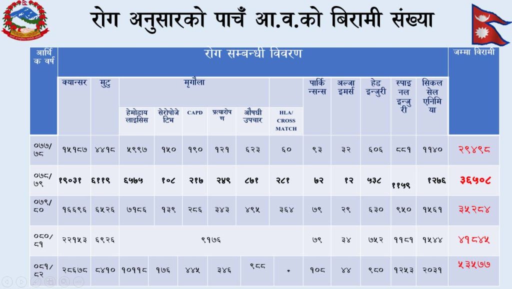 आव २०७७/७८ मा २८,४८५ बिरामी रहेकोमा आव २०७८/७९ मा ३६,८०८ बिरामी परे । आव २०७९/८० मा ३५,२६४ बिरामी परेको संख्या छ भने आव २०८०/८१ मा ४७,४५४ बिरामी परेर सहायता लिएको तथ्यांक छ । आव २०८१/८२ (आंशिक) मै ५२,५८७ बिरामी परेको तथ्यांक छ । सरकारले २०८१ चैत महिनादेखि हालसम्मको सहायता रकम भने वितरण गरेको छैन । यो अवधिको बिरामीको संख्या र सहायता रकमको विवरण यहाँ समावेश छैन ।
