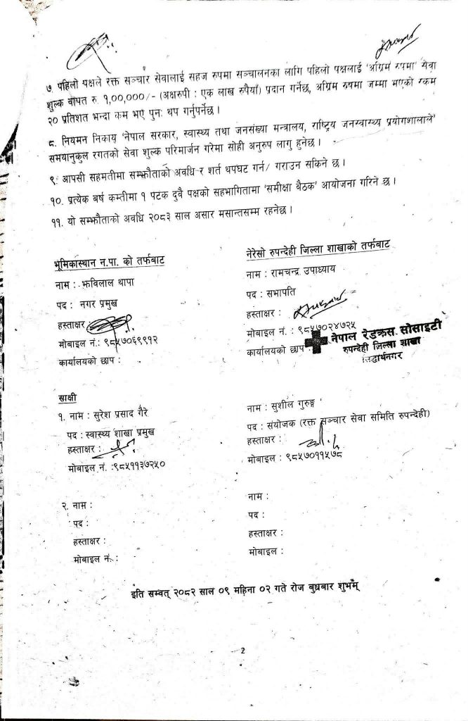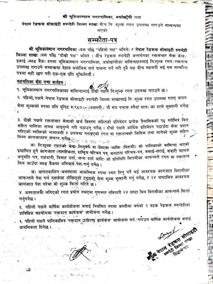 नगर प्रमुख झबिलाल थापा र नेपाल रेडक्रस सोसाइटी रुपन्देहीका सभापति रामचन्द्र उपाध्यायद्धारा सम्झौतामा हस्ताक्षर
