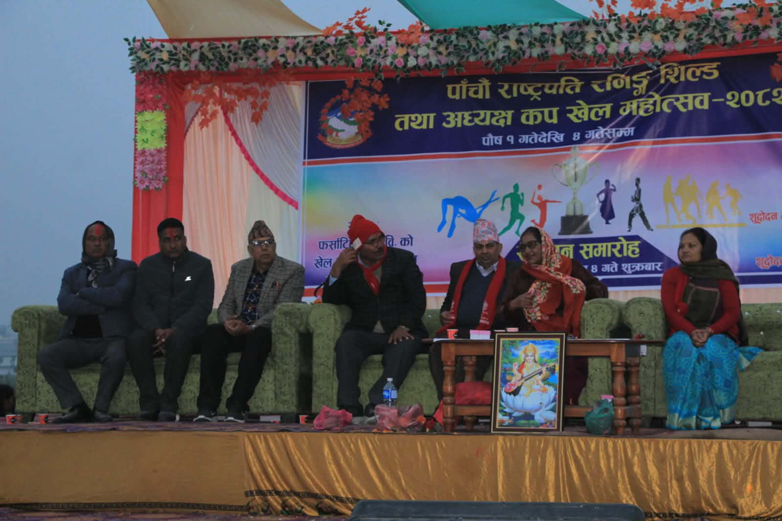 कार्यक्रम शुद्वोदन गाउँपालिका प्रवक्ता , शिक्षा समिति संयोजक एवं वार्ड नम्बर -४ का वडा अध्यक्ष केशव अधिकारीको अध्यक्षता,जिल्ला समन्वय समिति रुपन्देहीको प्रमुख उमाकान्त चापागाईंको प्रमुख आतिथ्यता, शुद्वोदन गाउँपालिका अध्यक्ष बिष्णु प्रसाद बस्याल एवं उपाध्यक्ष शान्ता ज्ञवालीको विशिस्ट आतिथ्यता ,शिक्षा प्रमुख चन्द्रकान्त शर्माको स्वागत मन्तव्यमा सम्पन्न कार्यक्रममा वार्ड नम्बर ५ का वडा अध्यक्ष चन्द्रभान चौधरी ,वार्ड नम्बर -२ का अध्यक्ष कमल खड्का ,गाउँपालिका खेल समिति संयोजक मुकेश कुवर र फर्साटिकर माविका प्रधानाध्यापक देवराज पौडेल लगायतले शुभकामना मन्तव्य दिनुभएको थियो ।