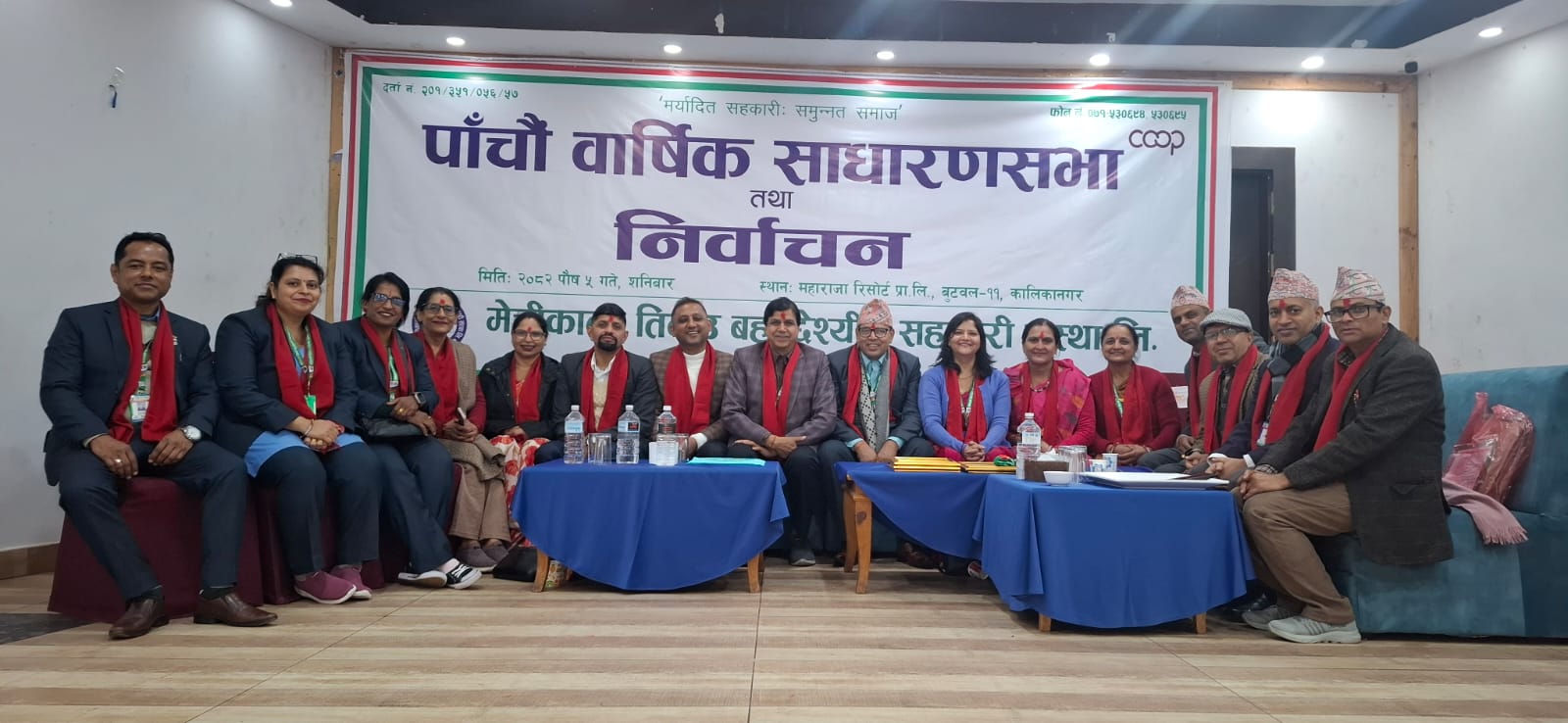 बुटवल । बुटवल–६ स्थित मेचीकाली तिनाउ बहुउद्देश्यीय सहकारी संस्था लिमिटेडको पाँचौँ वार्षिक साधारणसभा तथा निर्वाचन शनिबार सम्पन्न भएको छ । निर्वाचनबाट पुनः डिल्लीराज भण्डारीको अध्यक्षतामा सर्वसम्मत नयाँ नेतृत्व चयन गरिएको छ । जसको उपाध्यक्षमा सोमनाथ पाठक, सचिवमा सवितादेवि निरौला, कोषध्यक्षमा भेषराज पाण्डे चयन भएको निर्वाचन अधिकृत तथा संस्थाका पूर्व सल्लाहकार बसन्तराज खनालले जानकारी दिए । यस्तैगरी सदस्यहरुमा ऋषिराम बश्याल, हुमनाथ पाण्डेय, रामप्रसाद पन्थी, सारदा भुसाल न्यौपाने र हरिकला पन्त रहेका छन् । यस्तै लेखा सुपरिवेक्षण समिति संयोजकमा टिकाराम भट्टराई र सदस्यहरुमा चिरञ्जीवी अधिकारी र मिरा केसी श्रेष्ठ चयन भएका छन् ।