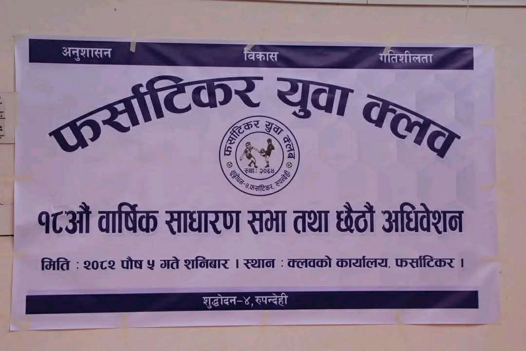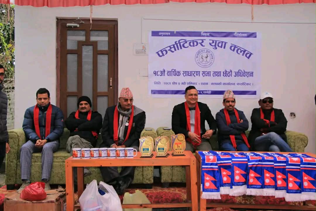 कार्यक्रम फर्साटिकर युवा क्लबका निवर्तमान अध्यक्ष मुकेश कुवरको अध्यक्षता, शुद्वोदन गाउँपालिका अध्यक्ष बिष्णु प्रसाद बस्यालको प्रमुख आतिथ्यता,शुद्वोदन गाउँपालिका प्रवक्ता एवं वार्ड नम्बर -४ का वडा अध्यक्ष केशव अधिकारीको विशिस्ट आतिथ्यतामा , सम्पन्न कार्यक्रममा क्लबका संस्थापक अध्यक्ष दामोदर पङ्गेनी ,सौ फर्साटिकर सिकाइ केन्द्रकी अध्यक्ष रामेस्वरी सिंह ,एनफा रुपन्देहीका अध्यक्ष लोकबहादुर पुन लगायतले शुभकामना मन्तव्य दिनुभएको थियोे ।