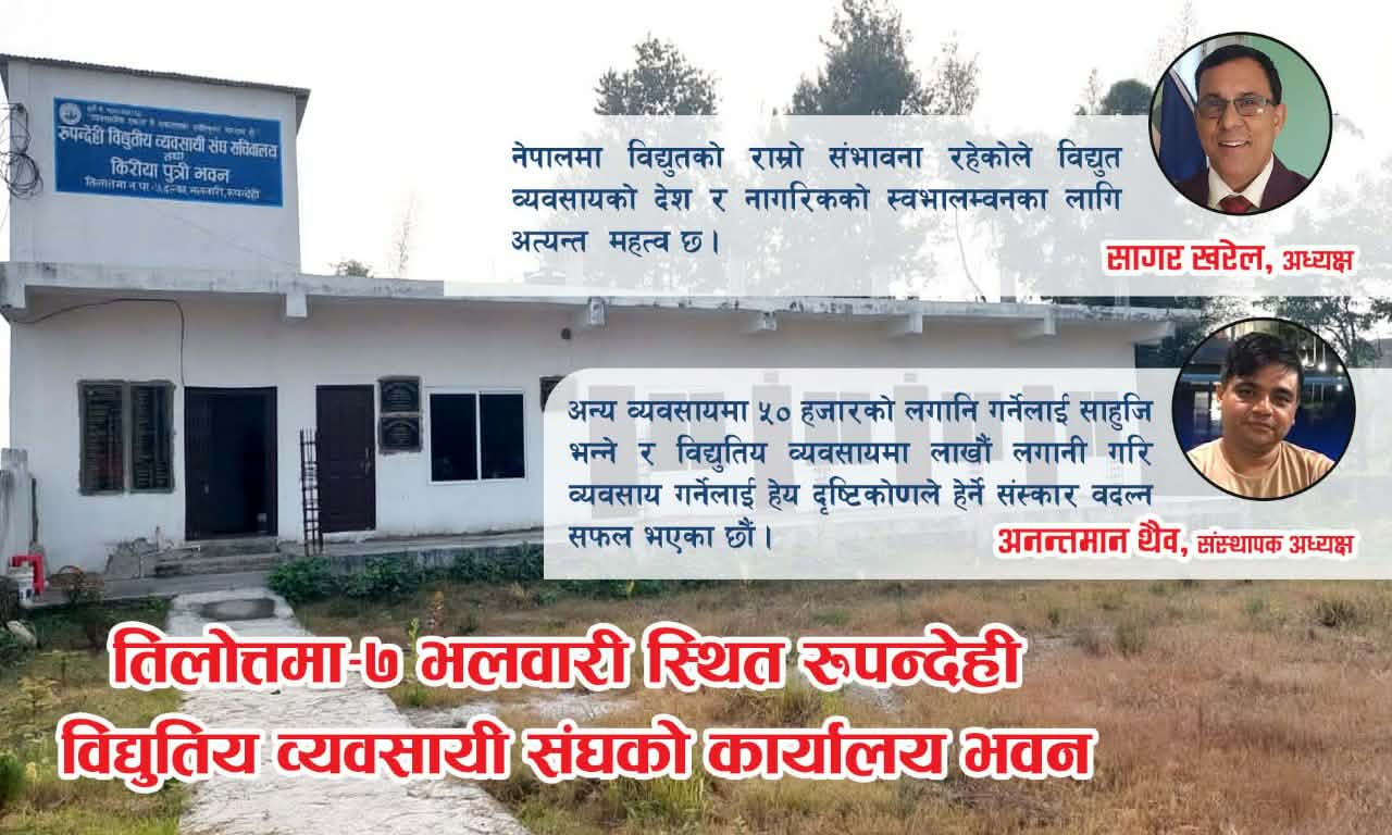 बुटवल । व्यवसाय केवल नाफामुखी गतिविधि होइन, समाजप्रति उत्तरदायित्व वहन गर्ने महत्वपूर्ण माध्यम पनि हो भन्ने उदाहरण बनेको छ–रूपन्देही विद्युतीय व्यवसायी संघ । विसं. २०६७ सालमा विधिवत् स्थापना भएको यो संघको यात्रा बुटवलका विद्युतीय व्यवसायीहरूले २०६५ सालमा स्थापना गरेको बुटवल विद्युतीय व्यवसायी संघबाट सुरु भएको हो । पछि जिल्लाभरका विद्युतीय व्यवसायीलाई समेट्दै यो संस्था रूपन्देही जिल्लाको छाता संगठनका रूपमा विकसित भयो ।