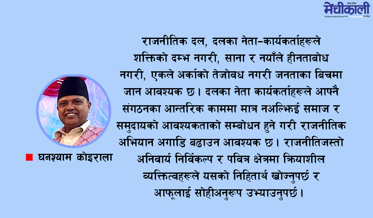 माथिल्ला पङ्क्तिहरूमा गुण, दोष, अधिकार, प्रवृत्ति आदिबारे केही चर्चा गरियो । हुन त समाजलाई सुन्दर, शान्त, समृद्ध र सभ्य बनाउन समाजका सबै क्षेत्र, सबै मानिसहरूको भूमिका हुन्छ तर यतिबेला नेपाली समाज राजनीतिबाट प्रभावित छ । देशमा राजनीतिक स्थिरता नभएको हुनाले पनि राजनीति बढी चर्चामा रहने गरेको हो । विरोधी हुन् वा समर्थक प्रायः सबै मानिसहरू राजनीतिक दल र नेताहरूबारे चर्चामा भुलिरहेको अवस्था रहेको छ । यस्तो अवस्थामा राजनीतिक दलहरू, दलका नेता–कार्यकर्ताहरूले शक्तिको दम्भ नगरी, साना र नयाँले हीनताबोध नगरी, एकले अर्काको तेजोवध नगरी जनताका बिचमा जान आवश्यक छ । दलका नेता कार्यकर्ताहरूले आफ्नै सङ्गठनका आन्तरिक काममा मात्र नअल्झिई समाज र समुदायको आवश्यकताको सम्बोधन हुने गरी राजनीतिक अभियान अगाडि बढाउन आवश्यक छ । राजनीतिजस्तो अनिवार्य, निर्विकल्प र पवित्र क्षेत्रमा क्रियाशील व्यक्तित्वहरूले यसको निहितार्थ खोज्नुपर्छ र आफूलाई सोहीअनुरूप उभ्याउनुपर्छ ।