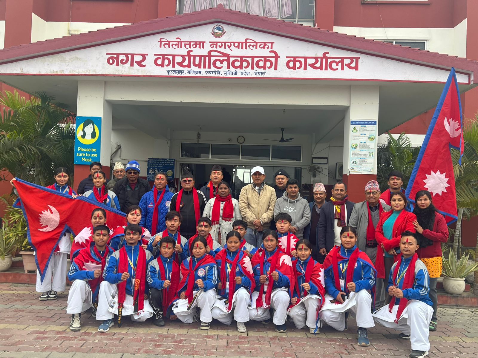 बुटवल । तिलोत्तमा नगरपालिकाका नगरप्रमुख रामकृष्ण खाँणले देशको इज्जत राख्ने खेलाडी उत्पादनमा नगरले सकेको सहयोग गर्दै आएको बताए । बुधबार जापान गोजुरियो मिसन नेपालको टोलीलाई शुभकामना तथा राष्ट्रिय झण्डा प्रदान गर्दै नगर प्रमुख खाणले सो कुरा बताए । तिलोत्तमाले आफ्नो क्षमताअनुसार खेल क्षेत्रलाई अगाढी बढाउन मद्दत गरेको भन्दै खेल क्षेत्रबाट नेपालको नाम राख्न र जीविकोपार्जनका लागि पनि सहज भएको बताए । सोही क्रममा उपमेयर जागेश्वरीदेवी चौधरीले खेलको विकासँगै आफ्नो अध्ययनलाई पनी निरन्तरता दिन अनुरोध गर्दै खेलमा उत्कृष्ट प्रदर्शन गरेर नेपालको नाम राख्न शुभकामना व्यक्त गरिन् ।
