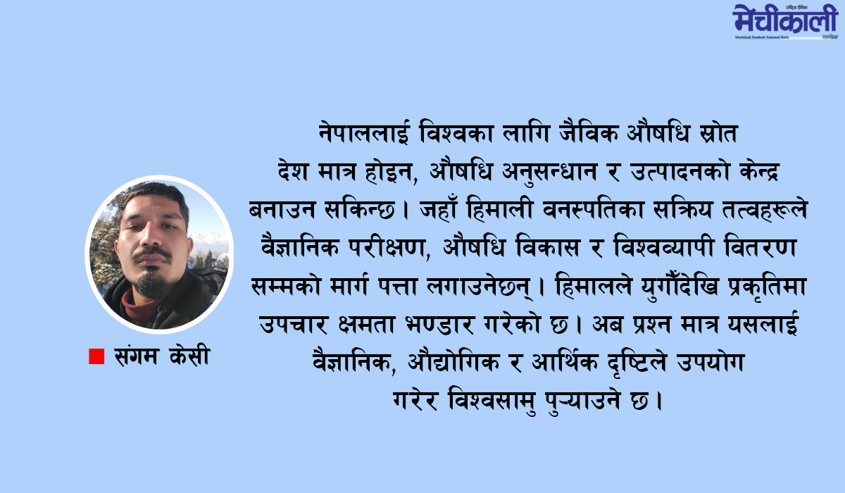 नेपाललाई विश्वका लागि जैविक औषधि स्रोत देश मात्र होइन, औषधि अनुसन्धान र उत्पादनको केन्द्र बनाउन सकिन्छ । जहाँ हिमाली वनस्पतिका सक्रिय तत्वहरूले वैज्ञानिक परीक्षण, औषधि विकास र विश्वव्यापी वितरण सम्मको मार्ग पत्ता लगाउनेछन् । हिमालले युगौँदेखि प्रकृतिमा उपचार क्षमता भण्डार गरेको छ । अब प्रश्न मात्र यसलाई वैज्ञानिक, औद्योगिक र आर्थिक दृष्टिले उपयोग गरेर विश्वसामु पु¥याउने छ ।
