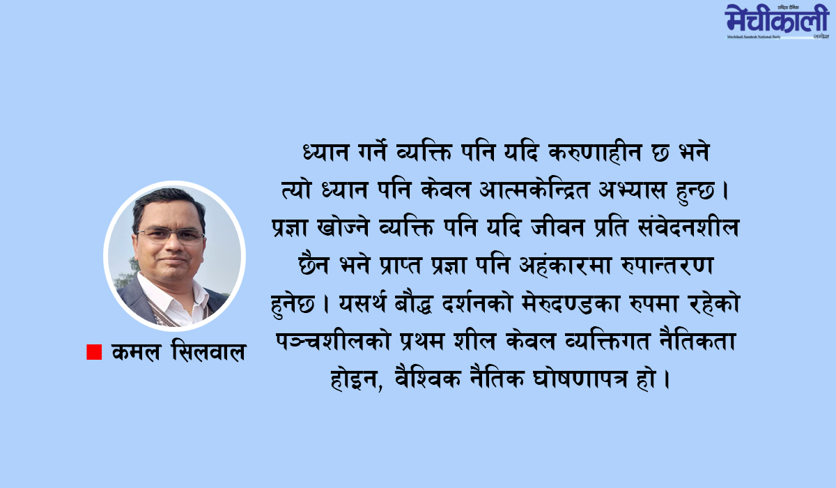 ध्यान गर्ने व्यक्ति पनि यदि करुणाहीन छ भने त्यो ध्यान पनि केवल आत्मकेन्द्रित अभ्यास हुन्छ । प्रज्ञा खोज्ने व्यक्ति पनि यदि जीवन प्रति संवेदनशील छैन भने प्राप्त प्रज्ञा पनि अहंकारमा रुपान्तरण हुनेछ । यसर्थ बौद्ध दर्शनको मेरुदण्डका रुपमा रहेको पञ्चशीलको प्रथम शील केवल व्यक्तिगत नैतिकता होइन, वैश्विक नैतिक घोषणापत्र हो । (लेखक लुम्बिनी बौद्ध विश्वविद्यालय स्नातकोत्तर तह प्रायोगिक बौद्ध अध्ययनतर्फ अध्ययनरत विद्यार्थी हुन् ।)