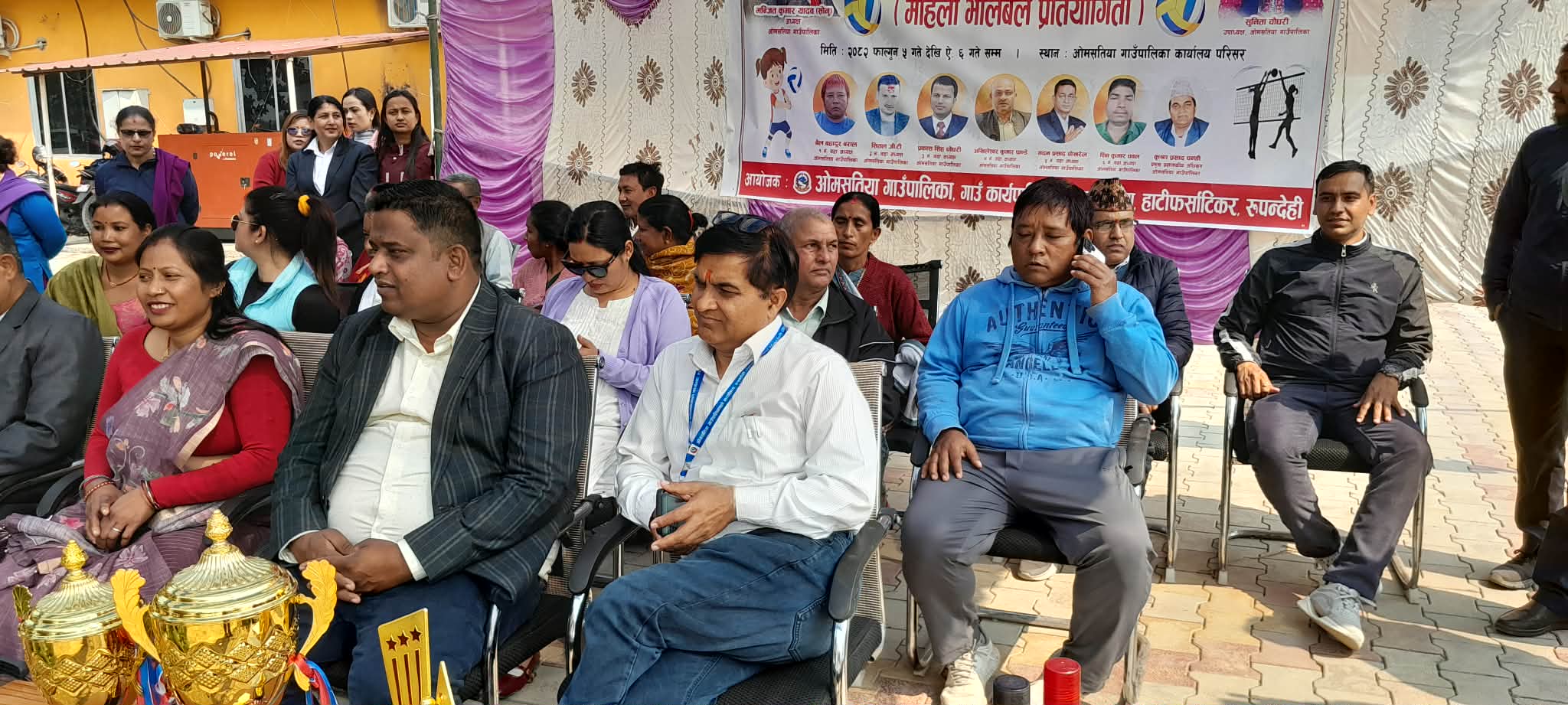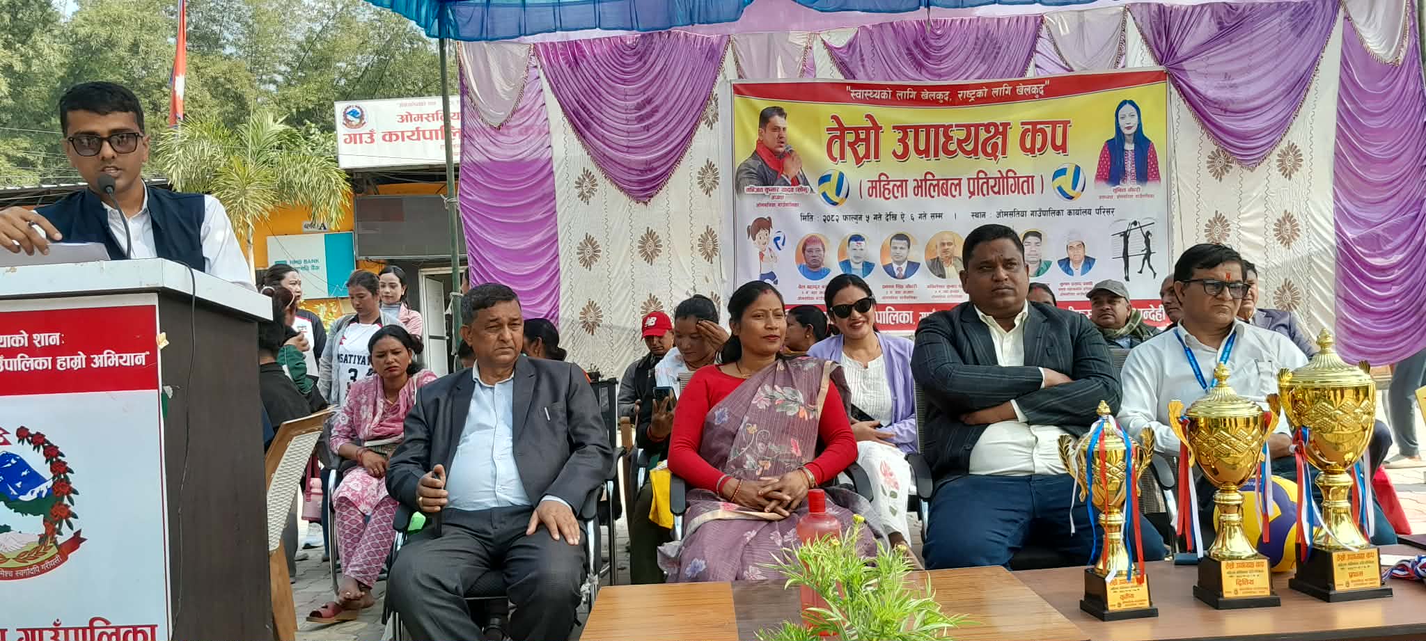 रुपन्देही स्थित ओमसतिया गाउँपालिकाको आयोजनामा ओमसतिया  तेस्रो उपाध्यक्ष कप महिला भलिबल प्रतियोगिता मंगलवारदेखी शुरु भयो । स्थानीय महिलाहरूलाई खेलकुदको माध्यमबाट जोड्दै उनीहरूको सशक्तिकरण गर्ने र लुकेको प्रतिभा प्रस्फुटन गराउने उद्देश्यका साथ गाउँपालिकाले तेस्रो उपाध्यक्ष कप महिला भलिबल प्रतियोगिता आयोजना गरिएको हो ।ओमसतिया गाउँपालिका उपाध्यक्ष सुनिता चौधरीले तेस्रो उपाध्यक्ष कप महिला भलिबल प्रतियोगिता उद्वाटन गर्नुभयो ।