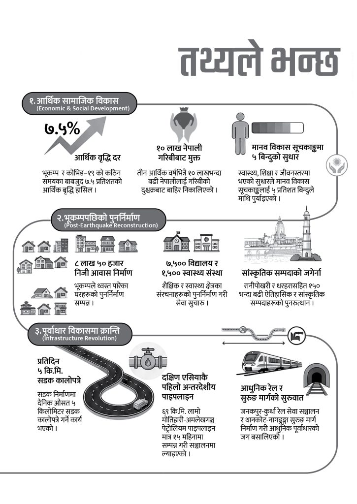विगत उपलब्धिको आधारमा तीव्र आर्थिक–सामाजिक रूपान्तरणको वाचा गर्दै पार्टीले स्थायित्व र विकासलाई एउटै सिक्काका दुई पाटा रूपमा प्रस्तुत गरिएको छ । यस घोषणापत्रले चुनावी प्रतिस्पर्धामा मात्र होइन, नीति–बहसको केन्द्रमा ‘आत्मनिर्भर, समृद्ध र सुशासित नेपाल’ को मार्गचित्र प्रस्तुत गरेको छ ।