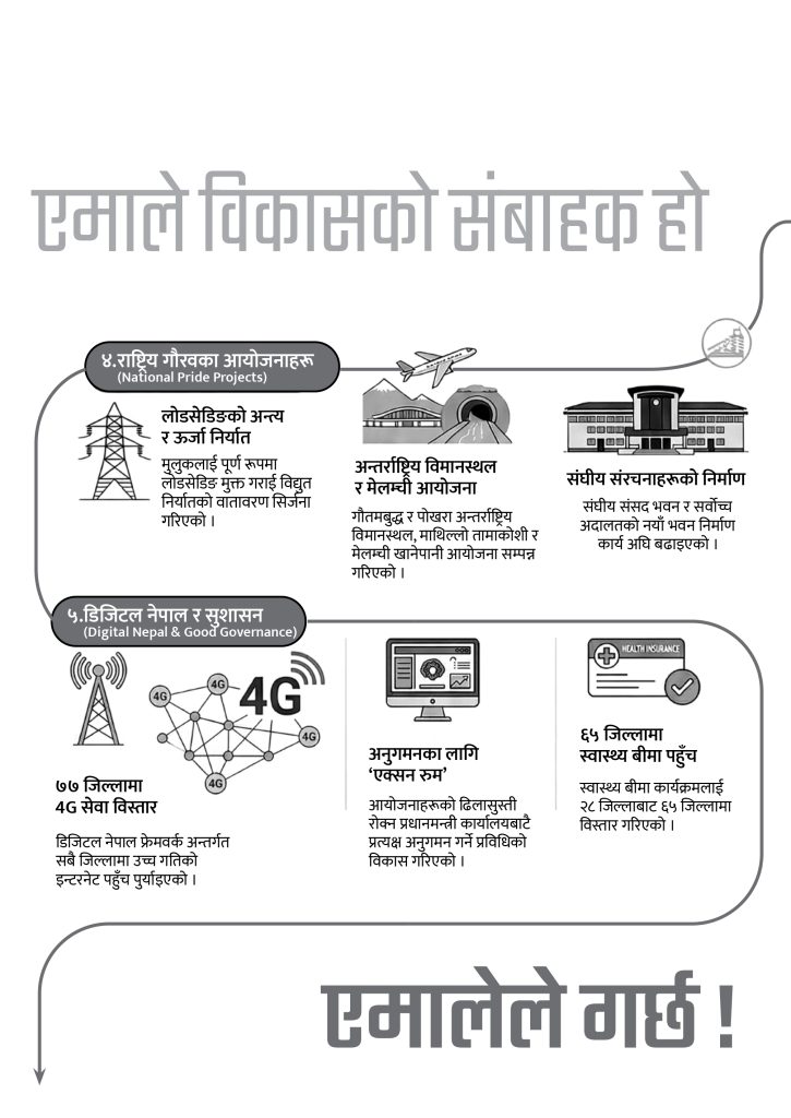 घोषणापत्रमा राष्ट्रिय गौरवका आयोजना, डिजिटल नेपाल र सुशासनलाई प्राथमिकतामा राखिएको छ । भूकम्प र कोभिड–१९ को चुनौतीबीच पनि ७.५ प्रतिशत आर्थिक वृद्धिदर हासिल गरेको तथा १० लाखभन्दा बढी नागरिकलाई गरिबीबाट मुक्त गरेको दाबी प्रस्तुत गरिएको छ ।