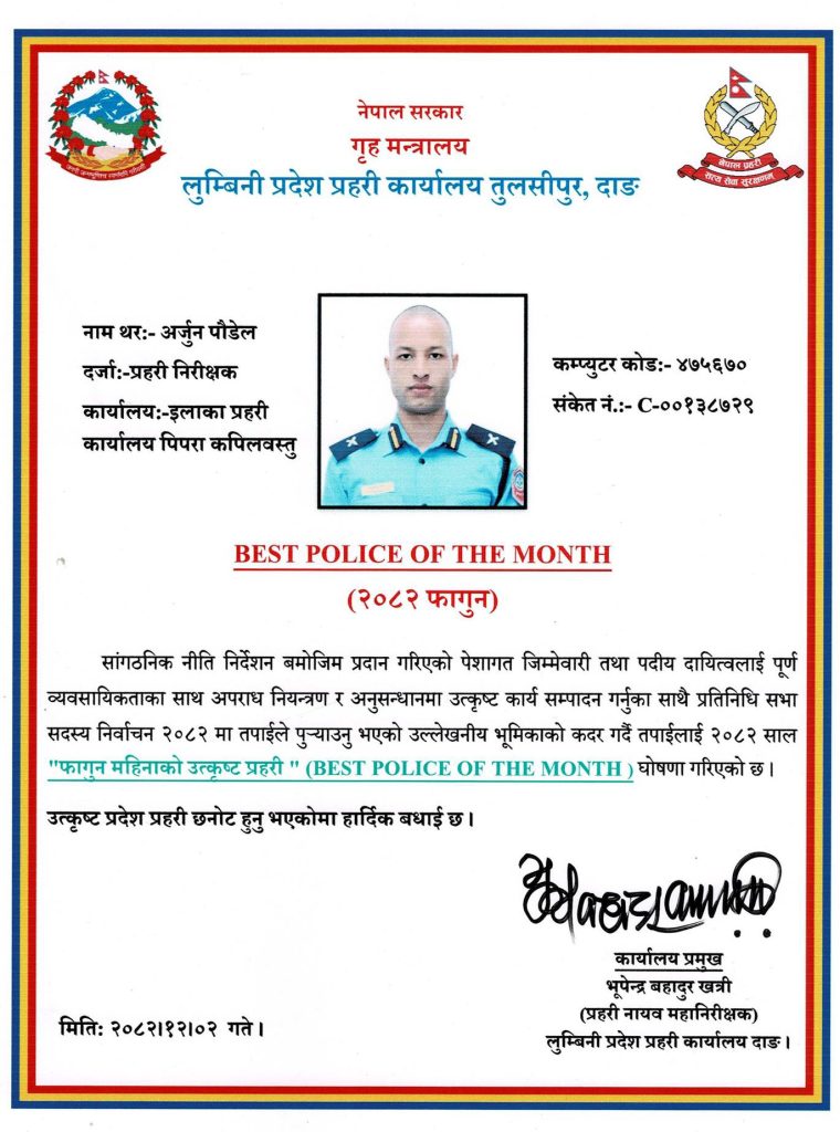 बुटवल । सुरक्षा व्यवस्थापन र अपराध नियन्त्रणमा उल्लेखनीय योगदान पु¥याउँदै आएका प्रहरी निरीक्षक अर्जन पौडेल ‘उत्कृष्ट प्रहरी’ घोषित भएका छन् । लुम्बिनी प्रदेश प्रहरी कार्यालय, तुलसीपुरले प्रहरी कर्मचारीहरूको कार्यसम्पादन मूल्यांकनका आधारमा फागुन महिनाका लागि प्रहरी निरीक्षक पौडेललाई उत्कृष्ट प्रहरी घोषणा गरेको हो ।