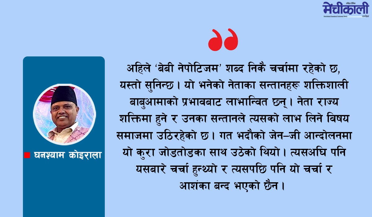 अहिले ‘बेबी नेपोटिजम’ शब्द निकै चर्चामा रहेको छ, यस्तो सुनिन्छ । यो भनेको नेताका सन्तानहरू शक्तिशाली बाबुआमाको प्रभावबाट लाभान्वित छन् । नेता राज्य शक्तिमा हुने र उनका सन्तानले त्यसको लाभ लिने विषय समाजमा उठिरहेको छ । गत भदौको जेन–जी आन्दोलनमा यो कुरा जोडतोडका साथ उठेको थियो । त्यसअघि पनि यसबारे चर्चा हुन्थ्यो र त्यसपछि पनि यो चर्चा र आशंका बन्द भएको छैन ।