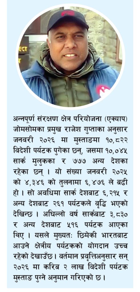 परम्परागत रूपमा कडा जाडोका कारण अफ–सिजन मानिने मुस्ताङमा यस वर्ष भने जाडोयाममै पर्यटक आगमनमा उल्लेखनीय वृद्धि भएको छ । अन्नपूर्ण संरक्षण क्षेत्र परियोजना (एक्याप) जोमसोमका प्रमुख राजेश गुप्ताका अनुसार जाडोयामको प्रमुख महिना जनवरीमा मात्रै १०,८२२ विदेशी पर्यटकले मुस्ताङ भ्रमण गरेका छन् । तीमध्ये १०,०४५ सार्क मुलुकका र ७७७ अन्य देशका रहेका छन् । अघिल्लो वर्ष जनवरी २०२५ मा ४,३४६ विदेशी पर्यटक मात्र आएकोमा एक वर्षमै ६,४७६ को वृद्धि भएको छ । त्यतिबेला सार्कबाट ३,८३० र अन्य देशबाट ५१६ पर्यटक आएको कार्यालयमा तथ्यांक छ । यस वर्षको वृद्धि मुख्यतः छिमेकी मुलुक भारतबाट आउने तीर्थयात्रीका कारण भएको तथ्यांकमा देखिन्छ । उनीहरुमध्येको ठुलो हिस्सा मुक्तिनाथ मन्दिरका लागि आउने गरेका छन् ।