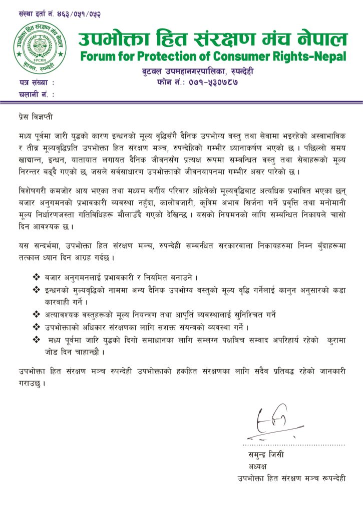 बुटवल । मध्यपूर्वमा जारी युद्धका कारण इन्धनको मूल्य बढेसँगै नेपालमा दैनिक उपभोग्य वस्तु तथा सेवामा भएको अस्वाभाविक मूल्यवृद्धिप्रति उपभोक्ता हित संरक्षण मञ्च, रुपन्देहीले गम्भीर ध्यानाकर्षण भएको जनाएको छ ।