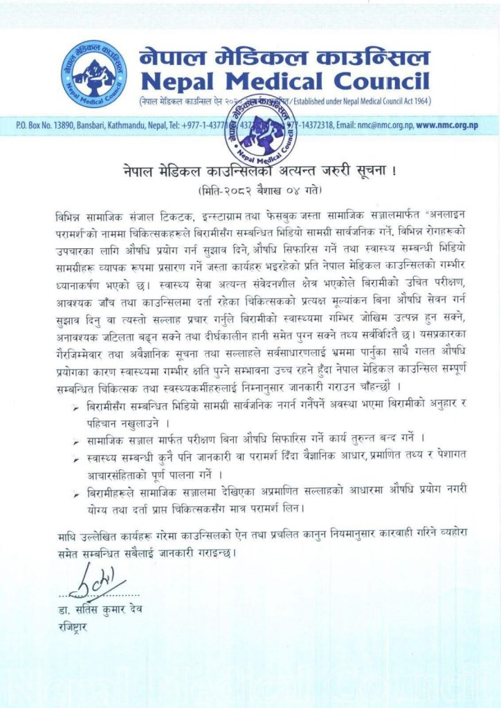 नेपाल मेडिकल काउन्सिलले सामाजिक सञ्जाल (टिकटक, फेसबुक, इन्स्टाग्राम आदि) मार्फत भइरहेको ‘अनलाइन परामर्श’ र स्वास्थ्यसम्बन्धी सामग्रीप्रति गम्भीर चासो व्यक्त गर्दै अत्यन्त जरुरी सूचना जारी गरेको छ । स्वास्थ्य सेवा अत्यन्त संवेदनशील क्षेत्र भएकोले बिरामीको उचित परीक्षण, आवश्यक जाँच तथा काउन्सिलमा दर्ता रहेका चिकित्सकको प्रत्यक्ष मूल्यांकन बिना औषधि सेवन गर्न सुझाव दिनु वा त्यस्तो सल्लाह प्रचार गर्नुले बिरामीको स्वास्थ्यमा गम्भीर जोखिम उत्पन्न हुने अनावश्यक जटिलता बढ्न सक्ने ठहर गर्दै त्यसले दीर्घकालीन हानी समेत गर्न सुचनामा उल्लेख छ । अनलाइन परामर्शका नाममा फेसबुक, टिकटक जस्ता सामाजिक सञ्जालमा चिकित्सकहरूको बिरामीसँग सम्बन्धित भिडियो सार्वजनिक गरेकोमा नेपाल मेडिकल काउन्सिलले ध्यानाकर्षण भएको जनाएको छ ।