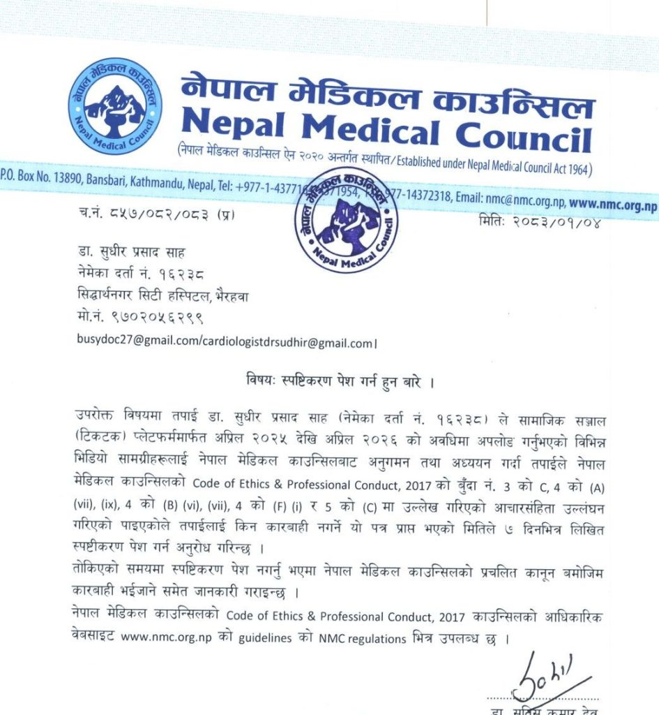 सामाजिक सञ्जालमार्फत आचारसंहिता विपरीत सामग्री प्रसारण गरेको आरोपमा एक चिकित्सकसँग नेपाल मेडिकल काउन्सिलले लिखित स्पष्टीकरण माग गरेको छ । काउन्सिलले ‘नैतिकता र व्यावसायिक आचरण संहिता’ अन्तर्गत विभिन्न बुँदाहरू उल्लंघन भएको ठहर गर्दै ७ दिनभित्र जवाफ दिन निर्देशन दिएको छ । तोकिएको समयभित्र स्पष्टीकरण नआए प्रचलित कानुनअनुसार कारबाही अगाडि बढाइने चेतावनी दिइएको छ ।