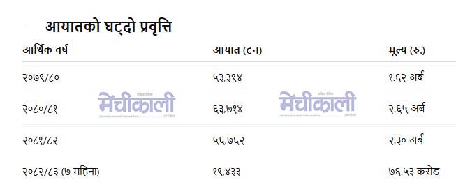नेपालमा केराको माग र उत्पादनबीच अझै ठुलो अन्तर देखिएको छ । वार्षिक माग करिब ९ लाख मेट्रिक टन रहेको छ । जसमा स्वदेशी उत्पादन भने करिब ५–७ लाख मेट्रिक टन मात्रै छ । यस्तै मासिक हिसाबमा गरिएको माग भने ८० हजार मेट्रिक टन रहेको छ । स्वदेशी उत्पादन भने मासिक ५०–६० हजार मेट्रिक टन मात्रै छ । यस हिसाबले मासिक अपुग २०–३० हजार मेट्रिक टन छ । यो अभाव पनि केही महिनाका लागि मात्रै रहेको किसानहरुको दाबी छ ।